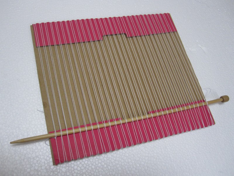 織り機の凸凹の溝と、編み棒にひっかけながら、縦糸を張る。