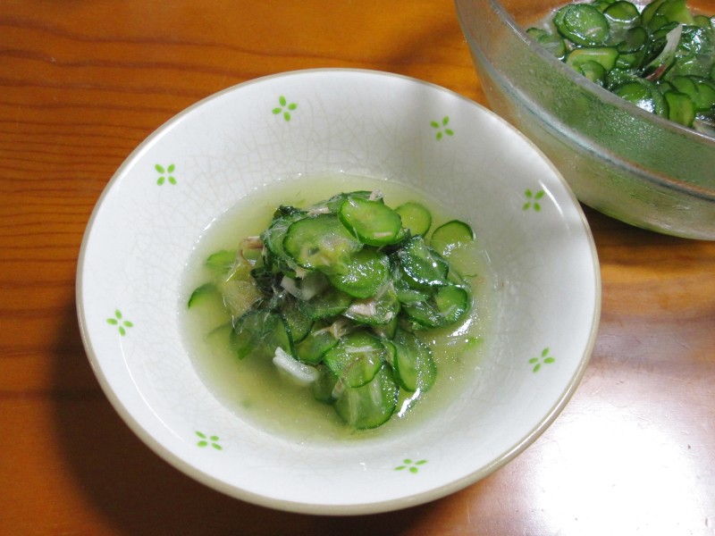 ↑キュウリとワカメの柚子ポンサラダ。夫の人に好評。