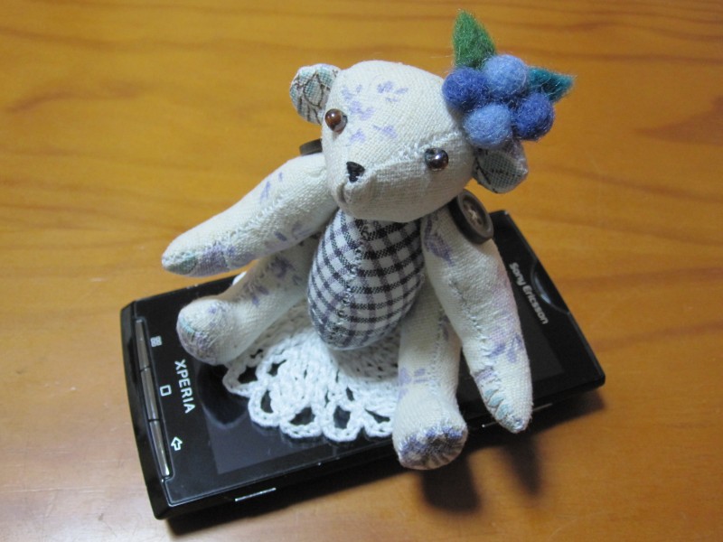 頭につけたブルーベリーの飾りは、ニードルフェルトで。