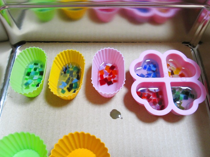 製氷皿にガラスのかけらを入れて、混ぜたレジン液を流し込んだ。
