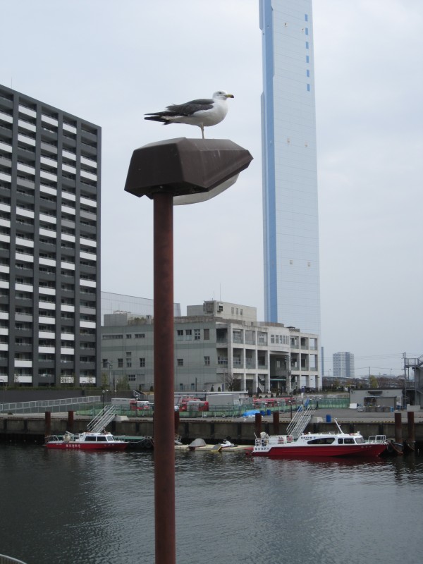 街灯の上、すぐ目の前のところに、ウミネコ?がいた。