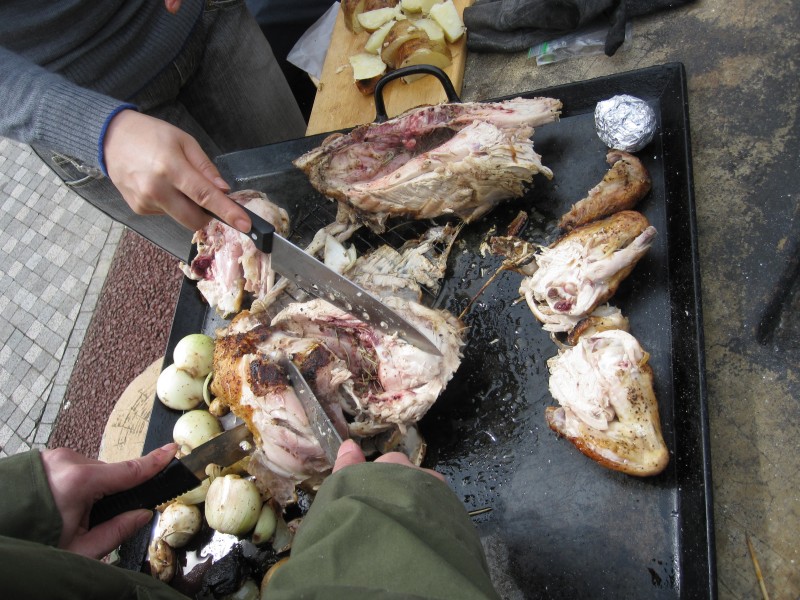 ↑丸鶏の解体作業。お腹の中には、マッシュルームや玉ねぎがゴロゴロ。