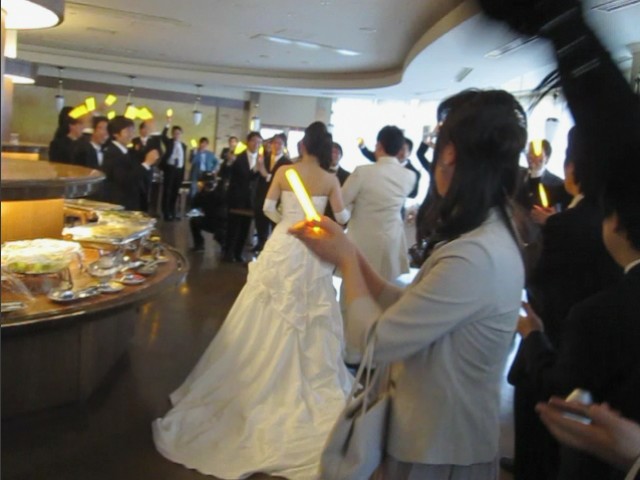 ↑照明が落とされ、みんなでサイリウムを振る中、新郎新婦が入場。