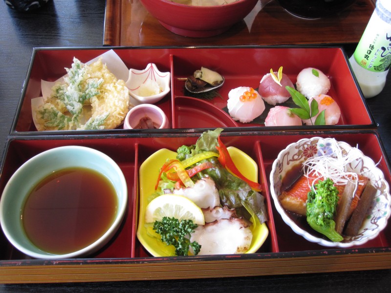 天ぷら・とこぶし・手まり寿司・たこサラダ・金目鯛煮魚。