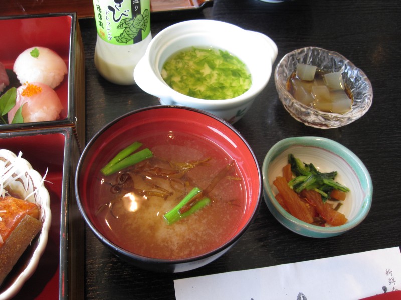 ↑磯部茶碗蒸し・黒みつ寒天・味噌汁・お漬物。