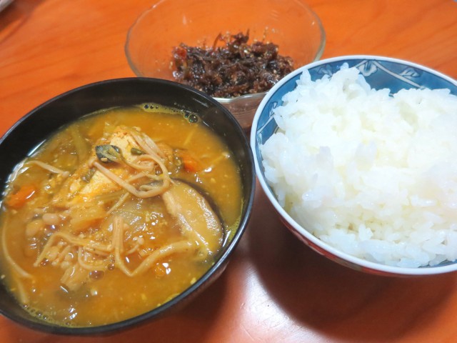 ↑おかか昆布・カボチャ味噌汁・ご飯。