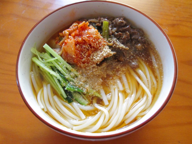 昨日のにんにくの芽&肉炒めの残りと、キュウリ・キムチをトッピング。