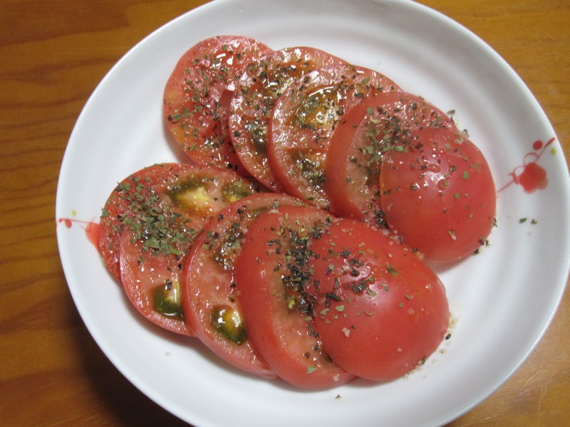 冷凍用に作った玉子焼きのはじっこと、昨日のトマトの残りも。