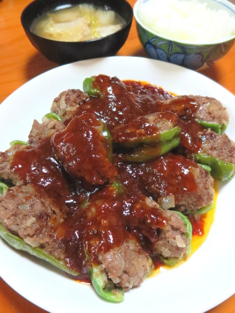 ↑夜ご飯。白菜スープ・ご飯・肉詰めピーマン。