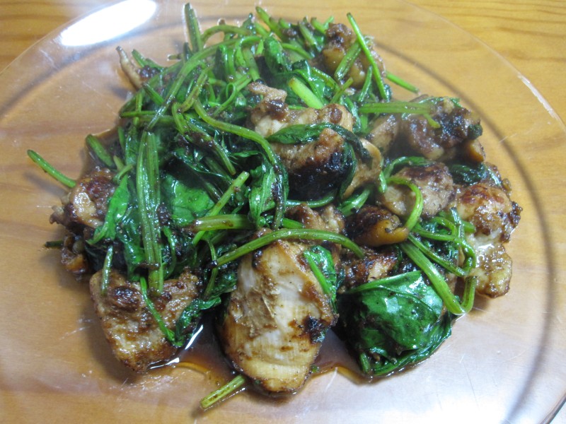 ↑長芋のマスタード焼き。豚肉とカブの葉も混ぜて焼いてみた。