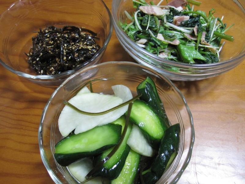 ↑おかか昆布煮・昨日のサラダ・大根とキュウリの甘酢漬け。