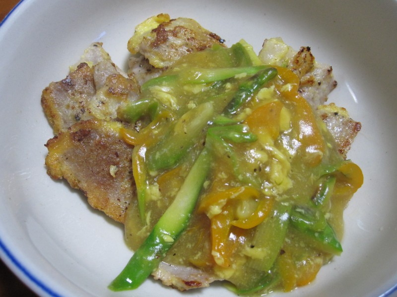 ↑豚肉のピカタ、残り野菜のあんかけソース。