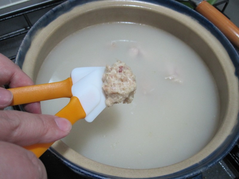 はすは、鶏のつくねを鍋に投入する担当。