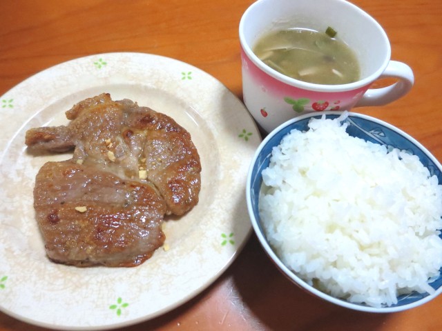 ↑夜ご飯。ポークステーキ・味噌スープ・ご飯。