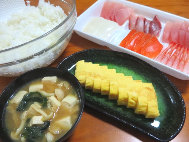 ↑夜ご飯。味噌汁・ご飯・豚肉と小松菜の炒め物。
