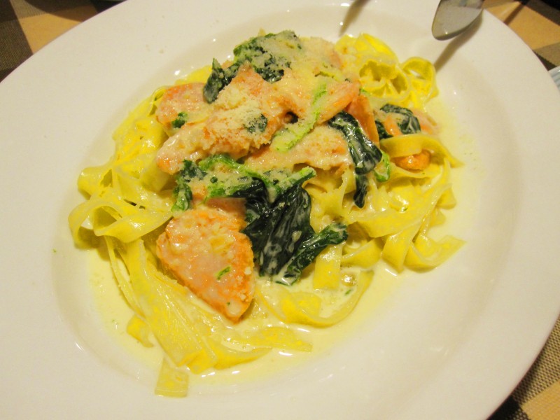 ↑スモークサーモンとイタリア産ほうれん草のクリームソース。