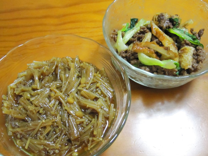 ひき肉・ちくわ・チンゲン菜の炒め物は、今朝お弁当を作った残り。