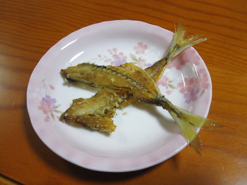 さっき3枚におろした時の中骨も揚げてくれて、おやつに。