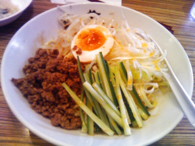 冷やし中華みたいに麺に具がのっていて、辛いスープがかかっていた。