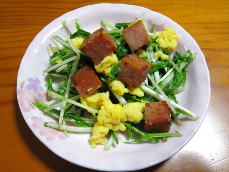 ↑スパムエッグ水菜サラダ。ライム添え。
