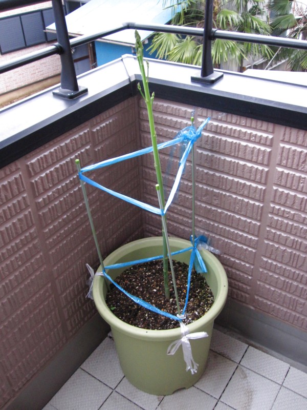 ベランダ栽培のアスパラちゃんは今、1本伸ばしているところ。