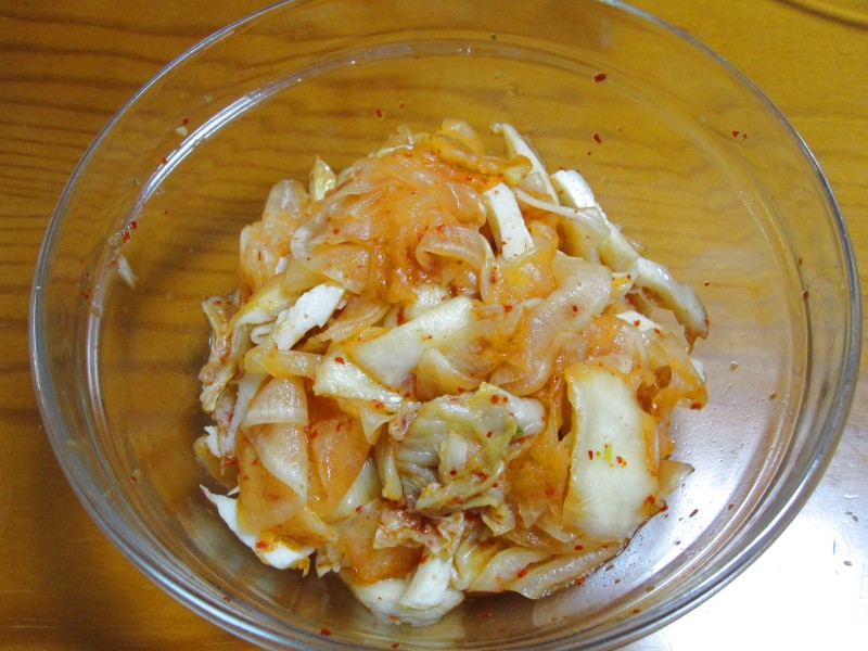 キムチと、大根の薄切りを混ぜて、辛さを軽減。