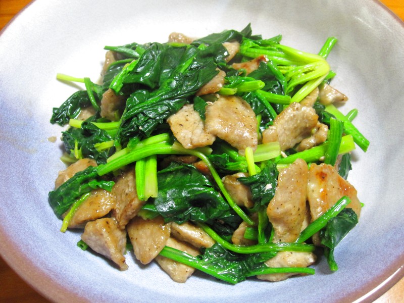 ↑豚肉とホウレン草のニンニク醤油バター炒め。