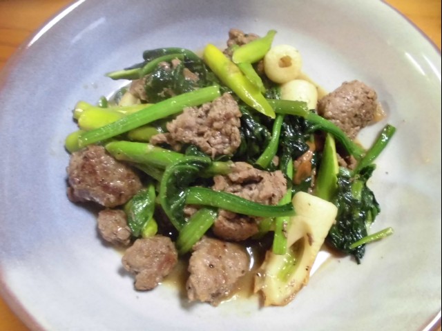 ↑ひき肉・ちくわ・アスパラ・ホウレン草の炒め物。