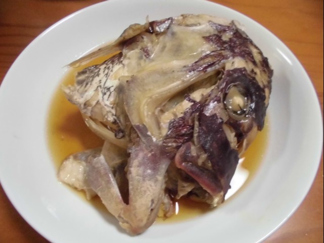 ↑鯛お頭煮・焼き豚切り落とし・ご飯・アスパラ素揚げ。