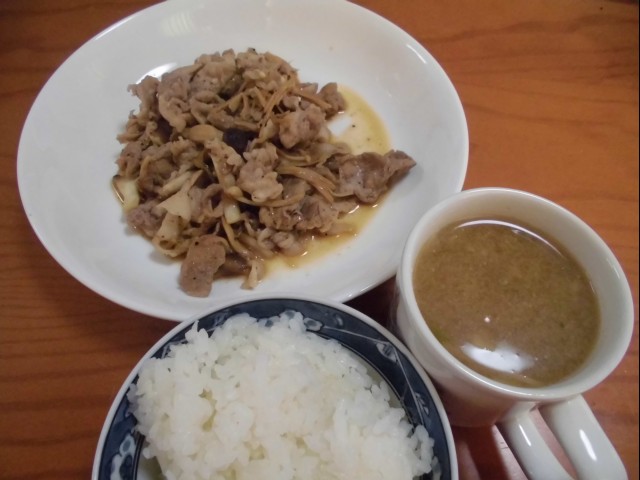 ↑昼ご飯。豚キノコ炒め・ご飯・味噌スープ。