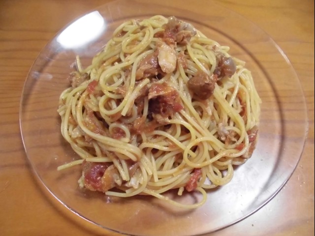 ↑夜ご飯。夫の人特製・トマトソースパスタ。