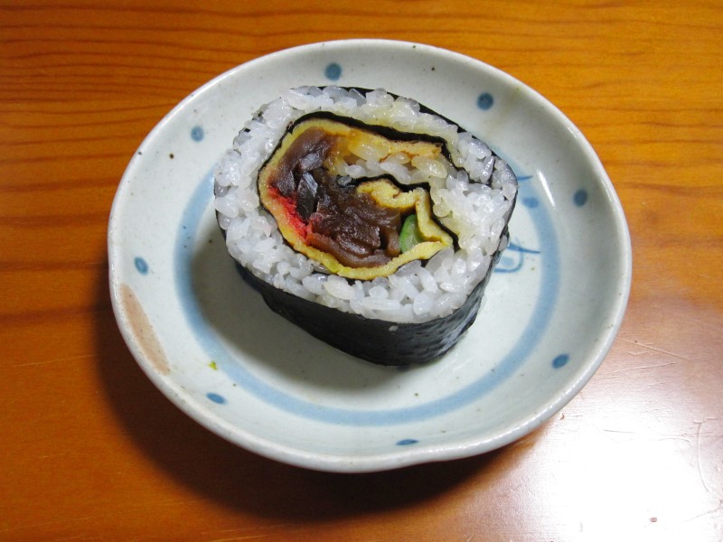 ↑夜ご飯。。。の前に、下からもらった太巻きを1切れ。