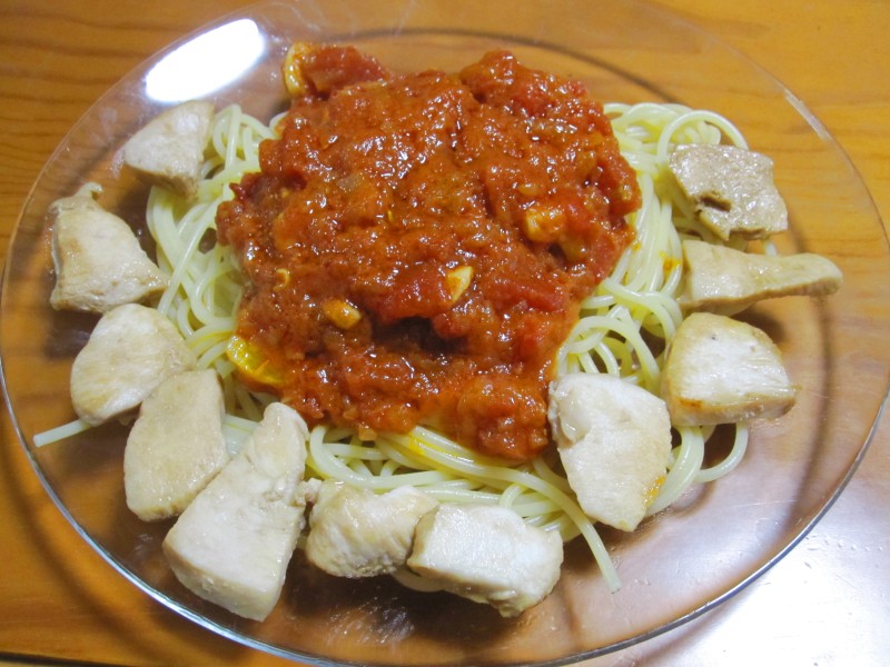 ↑トマトソースパスタ。鶏肉を焼いたのトッピング。