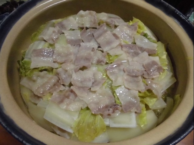 白菜と豚肉を重ねて、焼酎をかけて、弱火で蒸し煮。