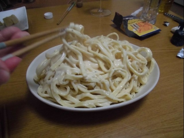 ↑半生パスタ、濃厚なチーズクリームソースで。