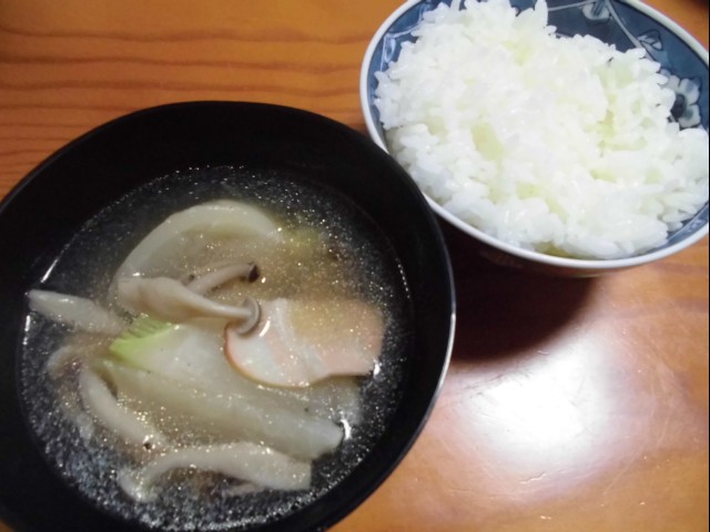 ↑夜ご飯。カブしめじベーコンスープ・ご飯。