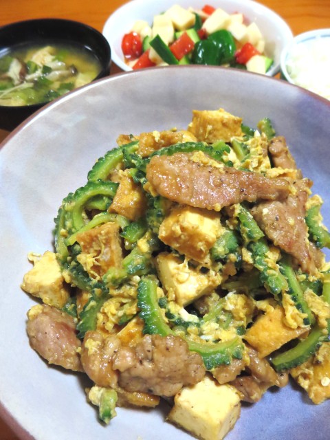 ↑夜ご飯。ゴーヤちゃんぷるー・味噌汁・サラダ・ご飯。