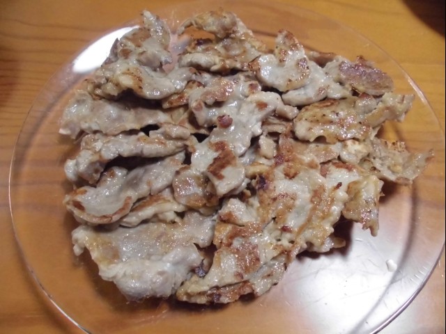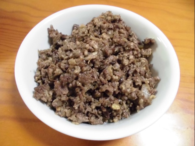 夫の人が、薄切り肉を細かく切って、そぼろを作ってくれた。