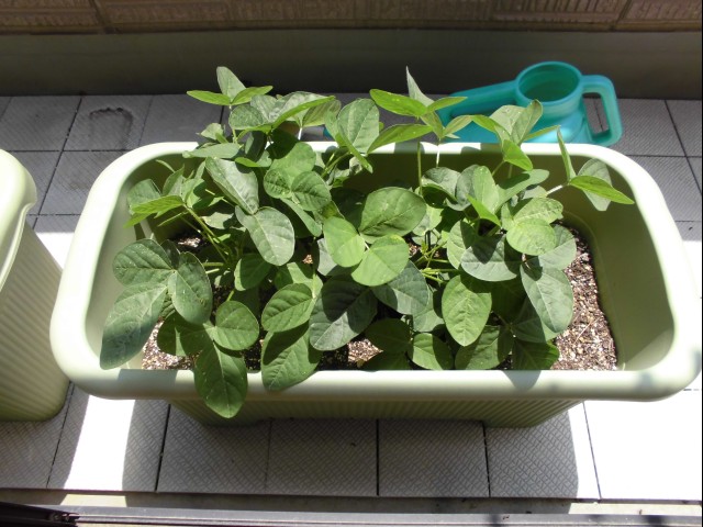 ベランダ栽培中の枝豆は、摘心したせいか、もっさりしてきた。