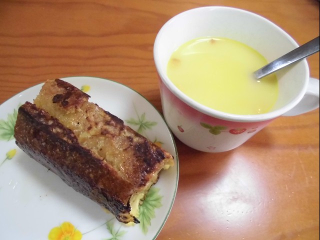 ↑朝ご飯。フレンチトースト・コーンスープ。