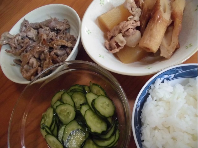 ↑昼ご飯。豚肉焼き・煮物・キュウリ浅漬け・ご飯。