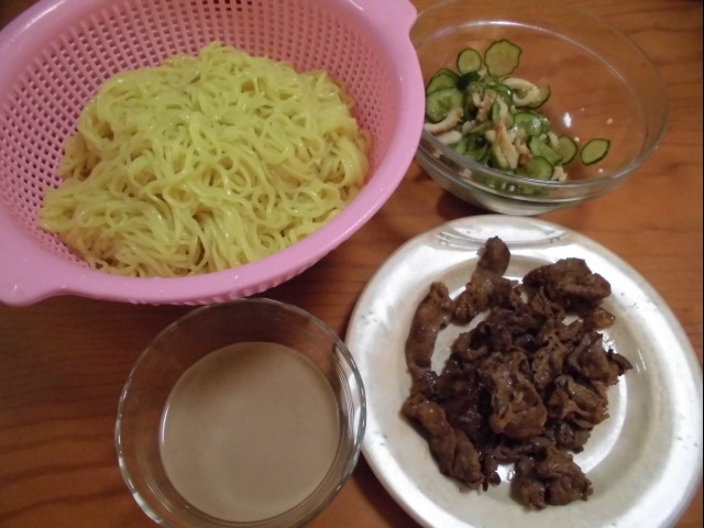 ↑帰宅してブランチ。ざるラーメン・サラダ残り・牛肉焼いたやつ。