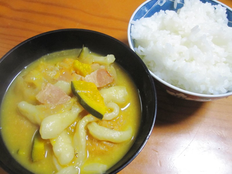 ↑カボチャ入りのほうとう風煮込み・ご飯。
