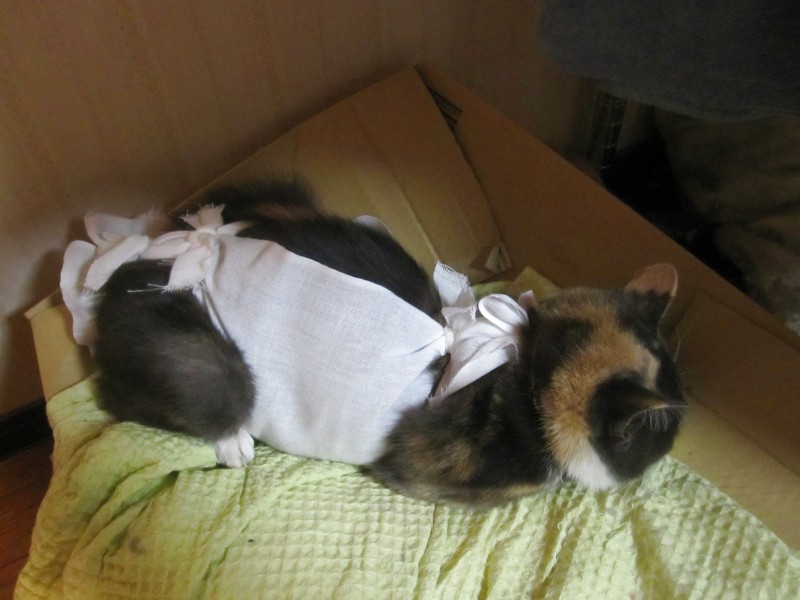 ガーゼの腹かけの上から、傷口の辺りも舐めようとしているのを発見。