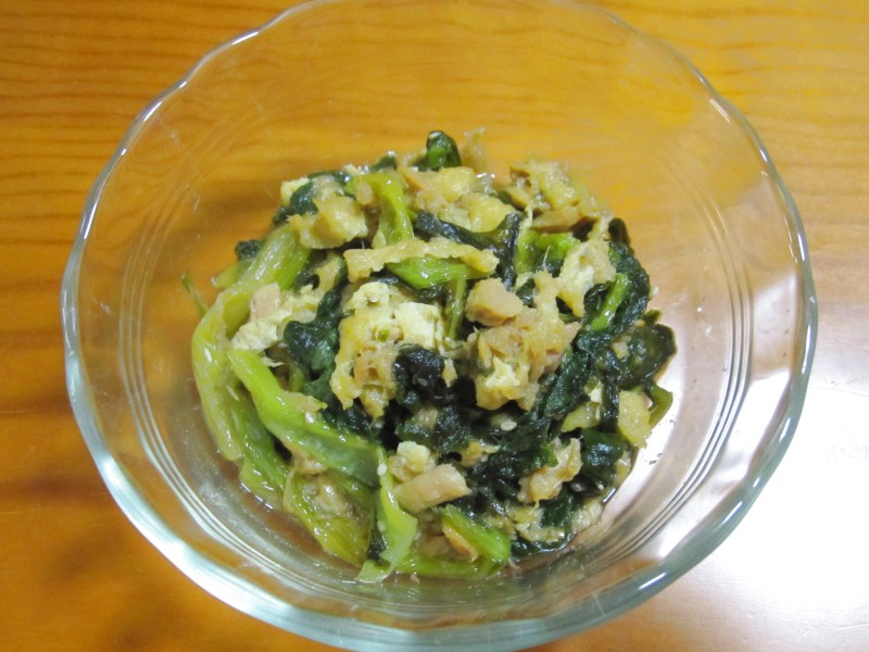 ↑カブの葉の炒め物。お揚げ&ツナ入り。