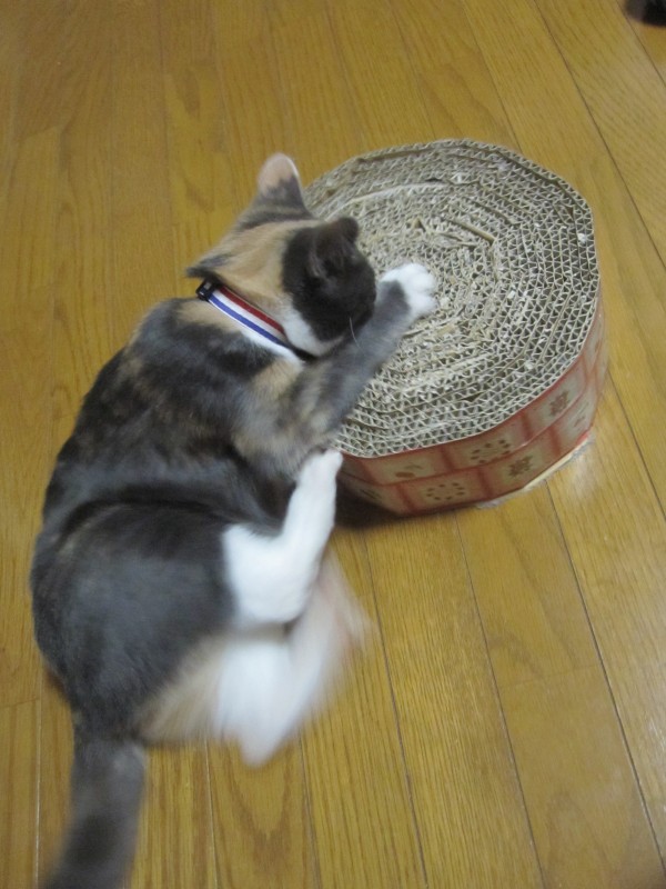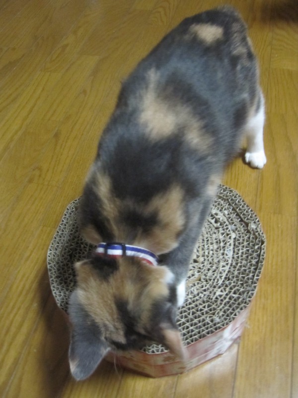 はすのお手製段ボール爪とぎが、だいぶ小さく見えてきた。