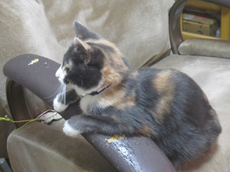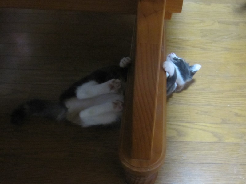 ↑食事中、またテーブルの脚の隙間で遊ぶ、レンたん。