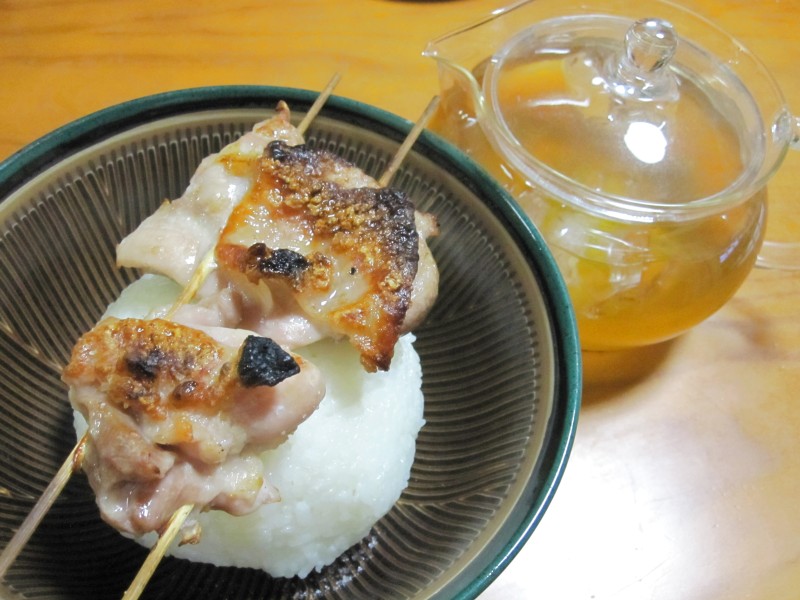 ↑焼き鳥をのせて。急須には氷で冷やしたおダシが。