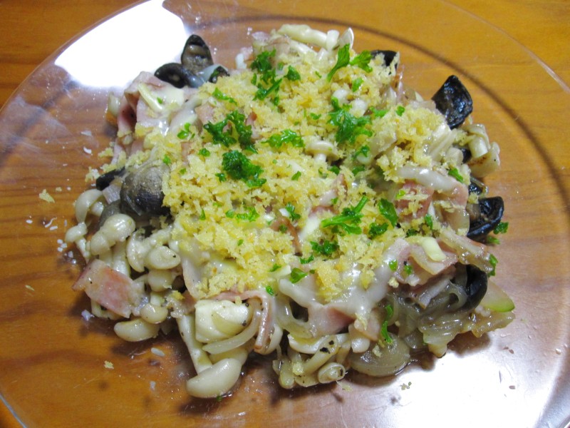 ↑キノコとベーコンの炒め物。パン粉とパセリを散らして。