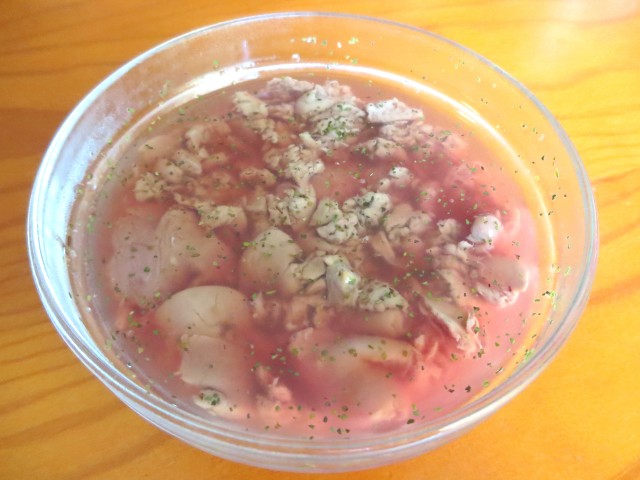 ↑料理酒ひたひたに漬けて、冷蔵庫へ入れる前のレバー。
